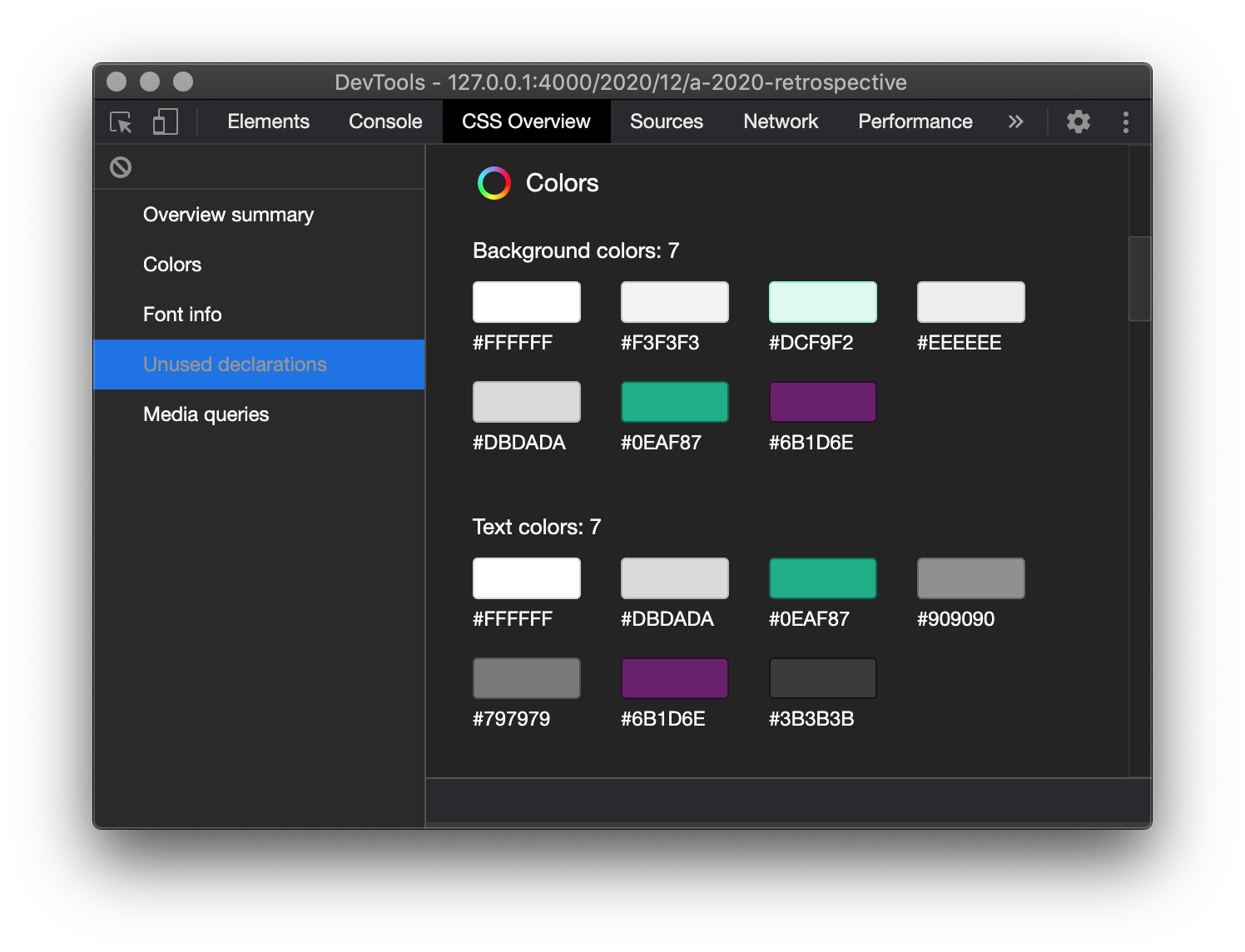 Chrome now has a CSS Overview tab in the developer tools. It's in beta at the moment, so to switch it on you have to go to Developer Tools, Settings (top right icon), then Experiments. I found this really useful when picking up a project that was already part-complete. It gives an overview of colours used (as pictured below for this blog running locally on my machine), main font sizes, media queries (are the various breakpoints matching?) plus any unused declarations. It's like a mini CSS consistency health checker. Looking forward to this feature getting further development and full release, I think it will become a regular part of my web development workflow.