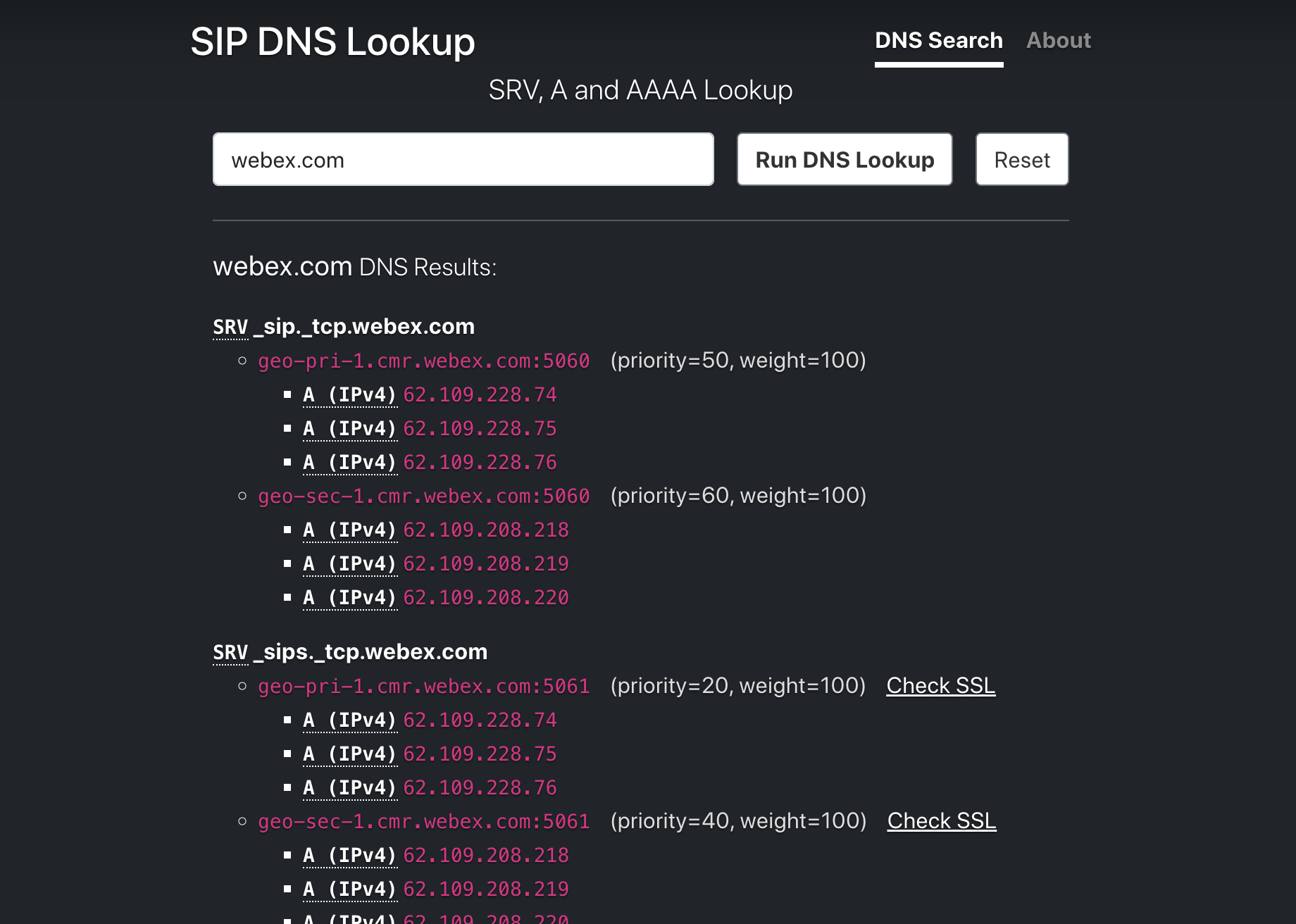 The site doesn’t do NAPTR records yet, which is yet another layer of DNS ‘fun’. Let me know if this would help you out and I’ll try add it. In my experience it’s nowhere near as prevalent as SRV records on their own are which is why I skipped for now.