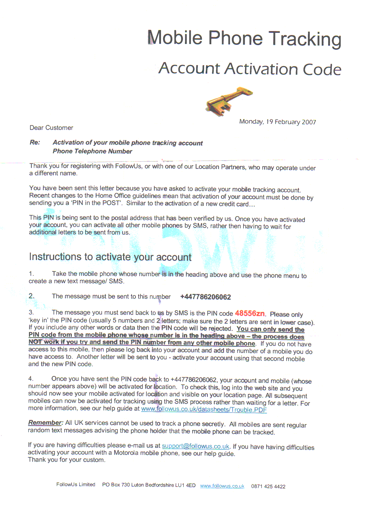 Follow Us was a ‘track a mobile number’ service. The site didn’t let just anybody sign up to track a mobile number though. You had to register, then get sent a pin in the post to verify your address. The mobile number you wanted to track then had to send this PIN via SMS to a specific number. The setup letter even has a reference to Home Office guidelines!